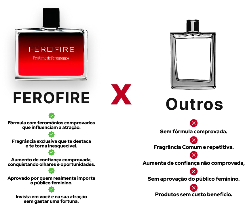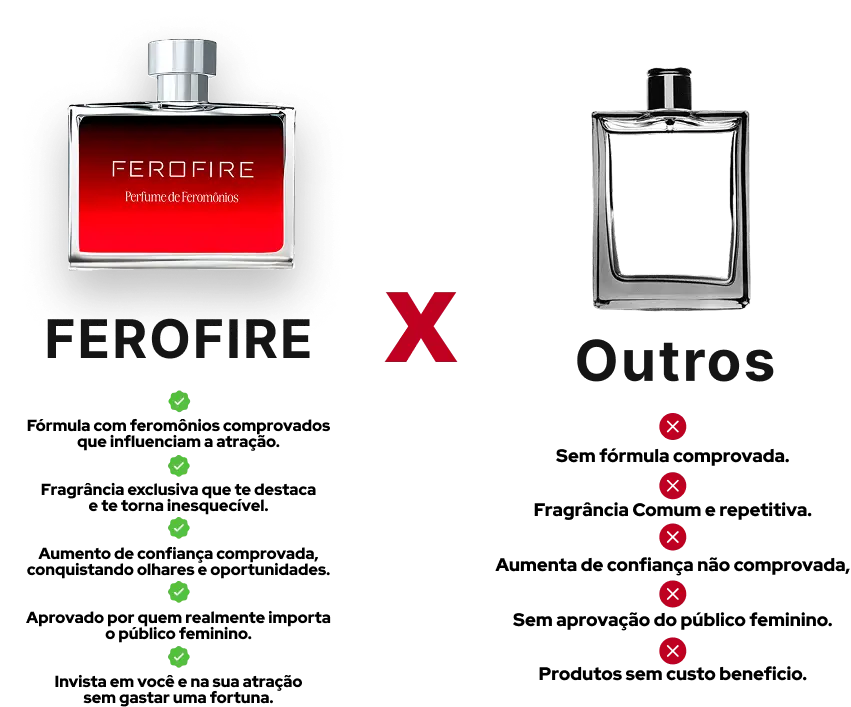 O Ferofire se destaca por sua fórmula exclusiva que combina feromônios de alta qualidade com uma fragrância sofisticada e envolvente. Ao contrário de outros perfumes de feromônio, o Ferofire não se limita apenas aos feromônios, mas também cria uma experiência sensorial única, com uma fragrância que realça a confiança e atrai naturalmente. A intensidade e a eficácia dos feromônios são cuidadosamente balanceadas para garantir uma atração sutil e elegante, criando uma presença envolvente sem exageros. Esse equilíbrio entre ciência e fragrância torna o Ferofire único.